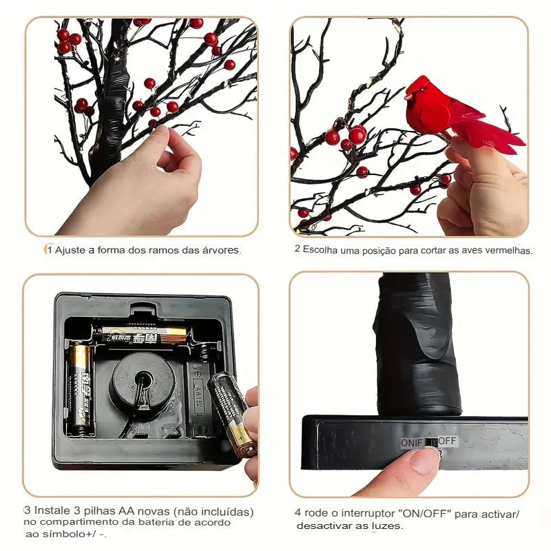 - Material: PVC ecológico + estrutura de plástico + galhos decorativos artificiais com lâmpadas LED embutidas, frutinhas vermelhas e enfeites de pássaros.